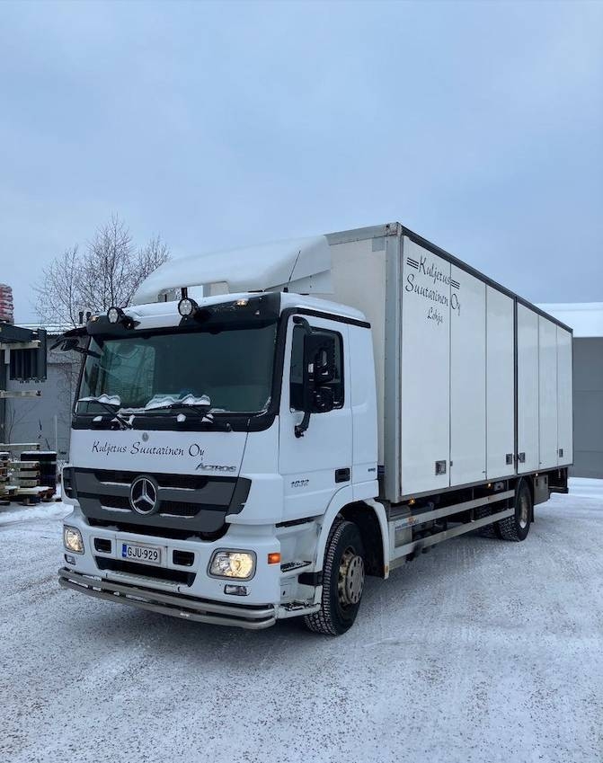 Mercedes‑Benz Actros Kontit mitat: 8,4 pituus ja 2,5korkeus, 2,55 leveys Kokonaiskorkeus 4m Kylkiaukeava. Robootti laatikolla. Webasto Vakkari